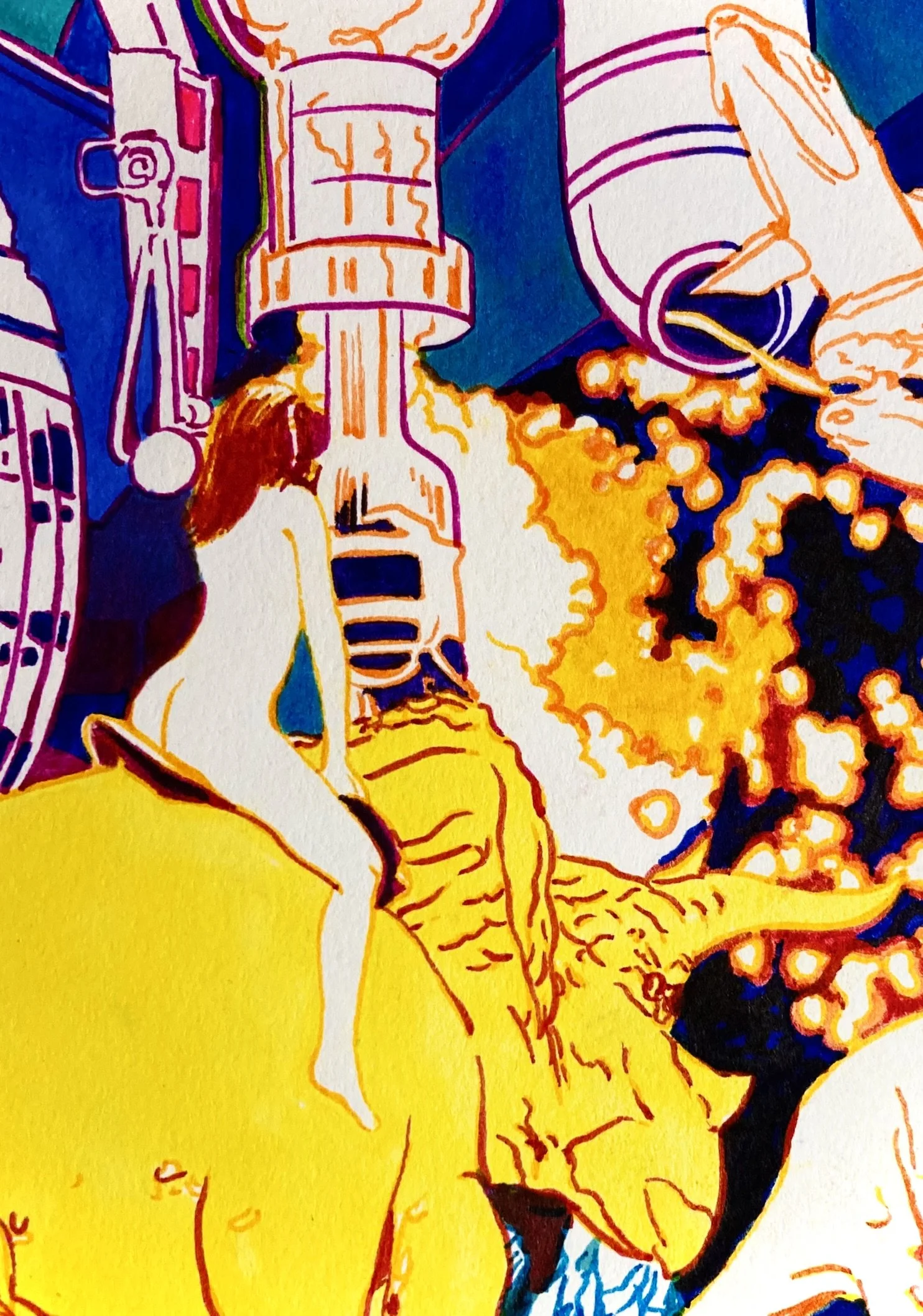 His name is Trycycle. He was born in captivity, but then, who wasn’t? He only eats meat. When I asked him why an herbivore only eats meat he responded airily, Because plants can’t defend themselves. He lets me throw hoops around his horns. It’s the only thing he lets me do, and so I do it. I toss circles into the air and they land round his bone thorns, and he is silent as a stone. He never dreams, I watch him while he sleeps, but the eyes never flutter. When I ask him about it, he says, Dream about what? What of gossip? I asked him. He was silent for long time then said, The brachiosaurus, the brachiosaurus. Can you imagine smelling a flower by putting it to your crown? [or, Underwater plants are a little overrated to grow a nose on your dome.] He looked longingly at me and I knew I didn’t really understand why this meant so much to him. I still don’t. When I straddle him, my breasts gleaming with oil, my hair so many strands in the wind, Trycycle stomps the earth like he’s making earthquakes for us to swim in. We’re practically God. Sometimes we run into other nude woman riding other dinosaurs, but we don’t talk to them and they don’t talk to us. We’re just nude ladies that ride dinosaurs and don’t feel the need to converse or form a club or anything. We just are because there’s a longing in the world that can only be answered by ladies in the buff riding roughshod lizards. We did not ask for this, all of us girls would be happy running the free market or divorcing SOBs, but here we are, riding. Trycycle especially dislikes miniature gold courses. Something about miniaturized stuff really sets him off. I say, Woah boy, it’s ok, it’s only young dates and board families, and yet, and yet. There’s probably a deeper story, but I’m a surface chick. He asked me why I don’t wear clothes, I could ask you the same question. There’s no end for us because there was no beginning. I asked, I said, Trycycle, what’s it like to be a symbol? It’s like everything else, he sighed, It doesn’t mean anything.